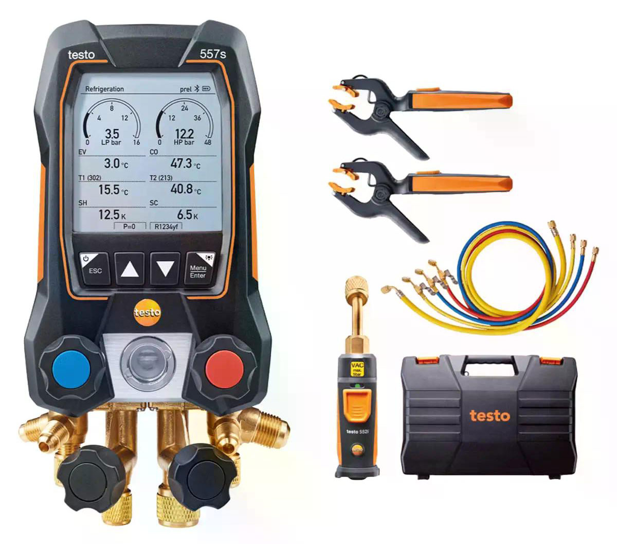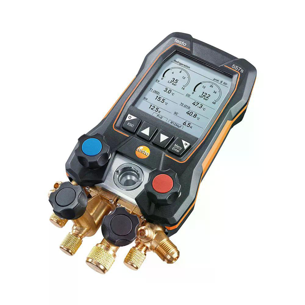 Цифровой манометрический коллектор Testo 557s комплект 2 в кейсе с шлангами - это универсальный прибор с широким функционалом для пусконаладки, измерения параметров работы и диагностики холодильных установок, систем кондиционирования, тепловых насосов. Базовые задачи - тестирование герметичности, расчет перегрева, переохлаждения, температуры испарения и конденсации, проведение вакуумирования.
