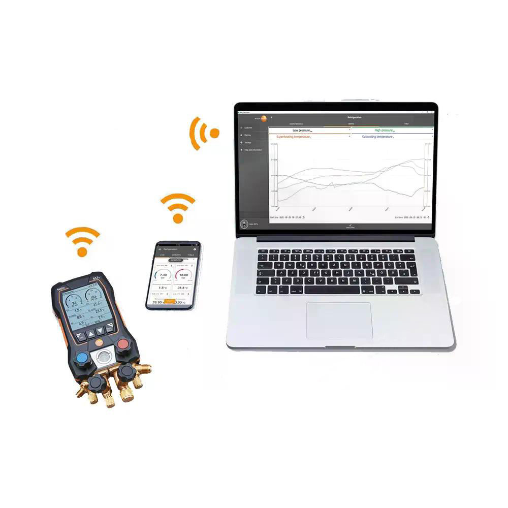 Цифровой манометрический коллектор Testo 557s комплект 2 прост в освоении благодаря понятному интерфейсу с встроенным аппаратом подсказок, которые помогают правильно выполнить все подключения для тестирования. Прибор поддерживает множество типов хладагентов, настройки для некоторых уже предустановлены в систему. При этом всегда можно обновить список хладагентов через фирменную техподдержку и/или мобильное приложение.