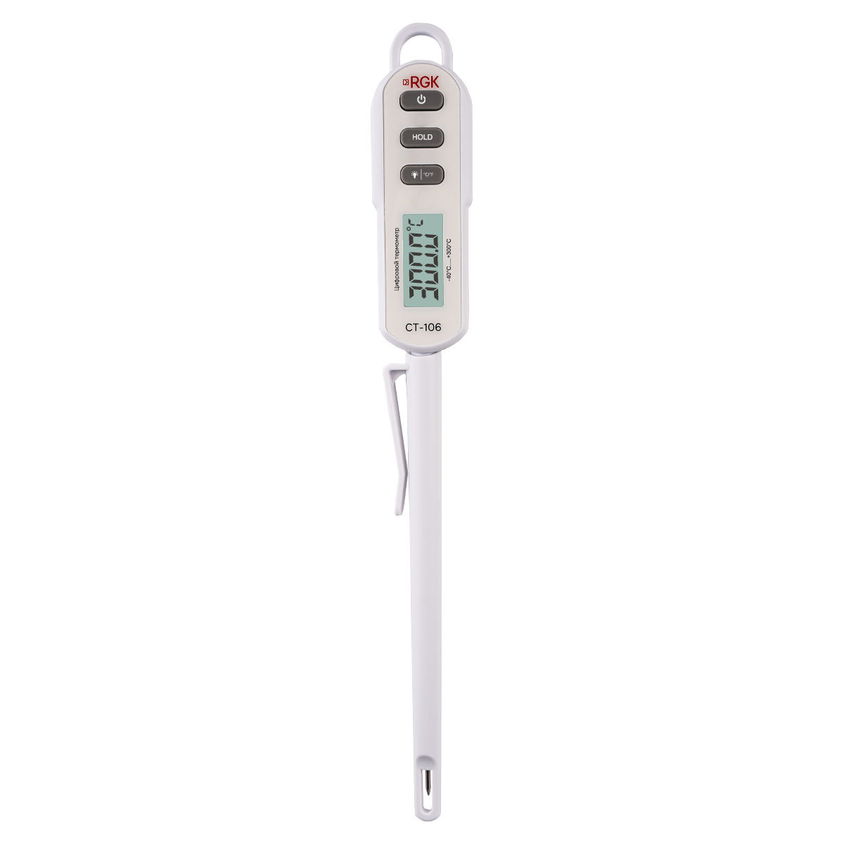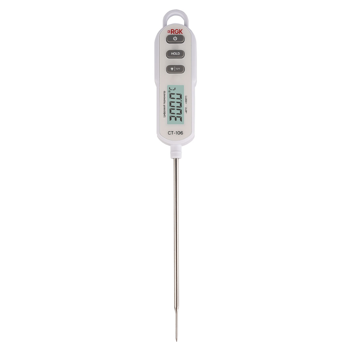 Термометр цифровой RGK CT-106 служит для контактного измерения температурных параметров целевых объектов в пределах от -40 до + 300°C, обеспечивая точность ±0,5°С в диапазоне от –20 до +150°С. Инструмент оснащен батарейным питанием и несъемным заостренным и утонченным в передней части погружным зондом, оболочка которого изготовлена из пищевой нержавеющей стали, позволяющим оперативно определять температуру внутри жидких, вязких, сыпучих веществ и материалов, продуктов питания и т.п. Изделие характеризуется высоким быстродействием за счет малого времени отклика и подходит для бытового и профессионального применения.